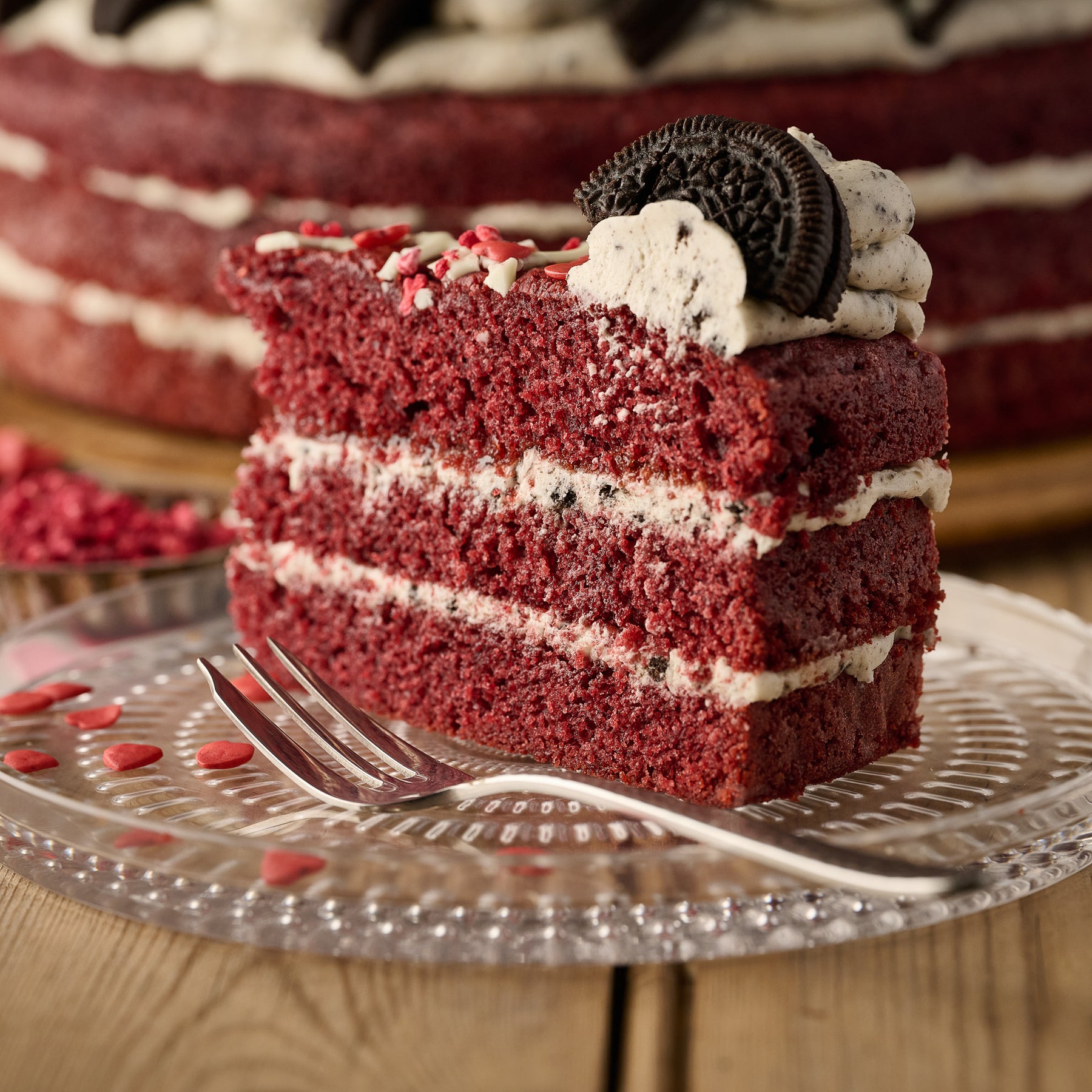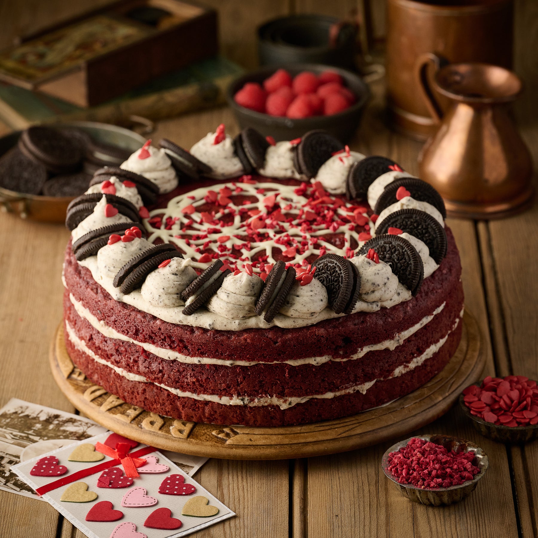 A rich red velvet sponge layered with cookie and cream frosting and a tangy raspberry jam. Topped with more cookie and cream frosting, Oreo biscuits, a white chocolate drizzle, red heart sprinkles, and a sprinkling of freeze-dried raspberry crumb.