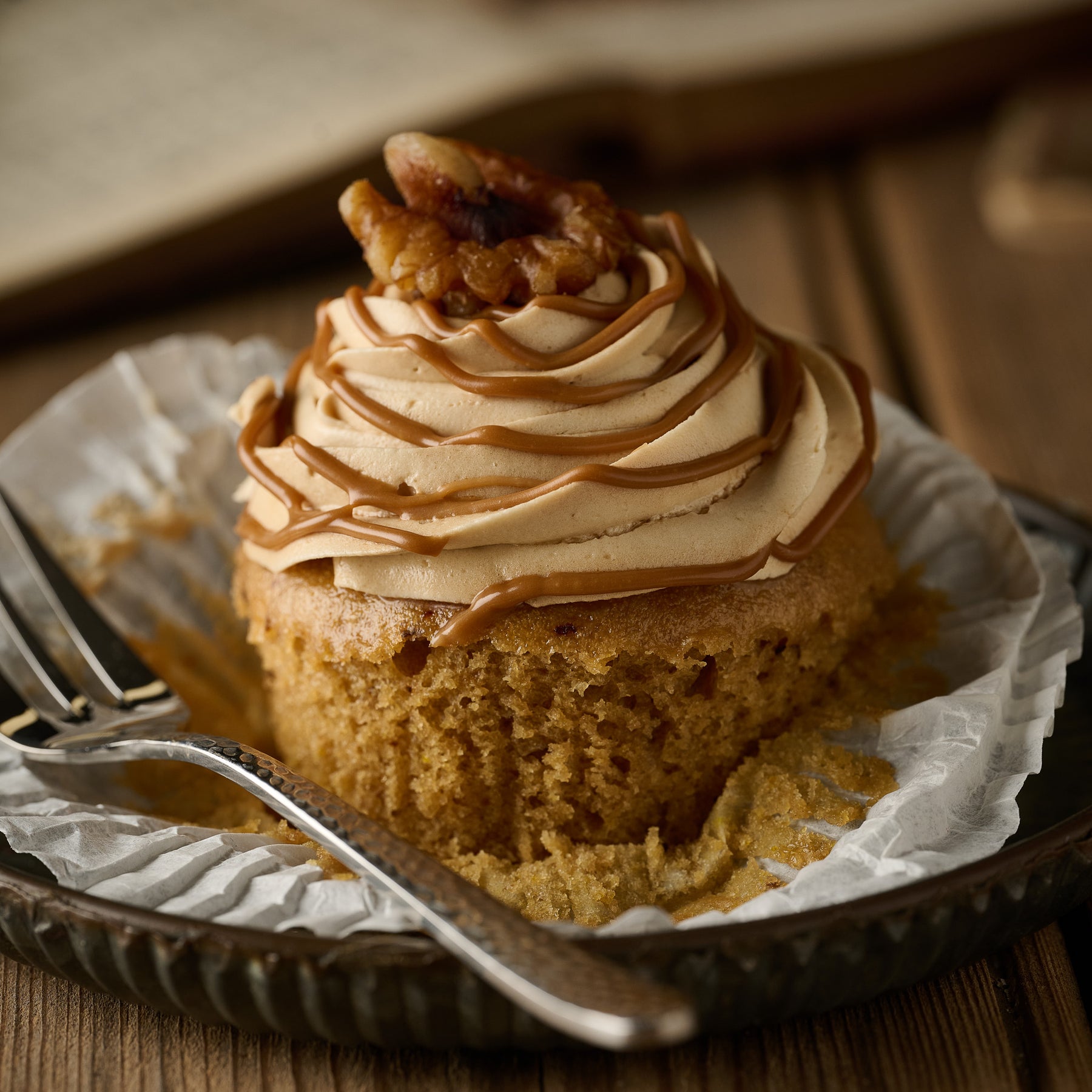A coffee cupcake, baked with walnut pieces. Finished with smooth coffee frosting, a drizzle of caramel and coffee icing, and topped with a walnut half for the perfect finishing touch.