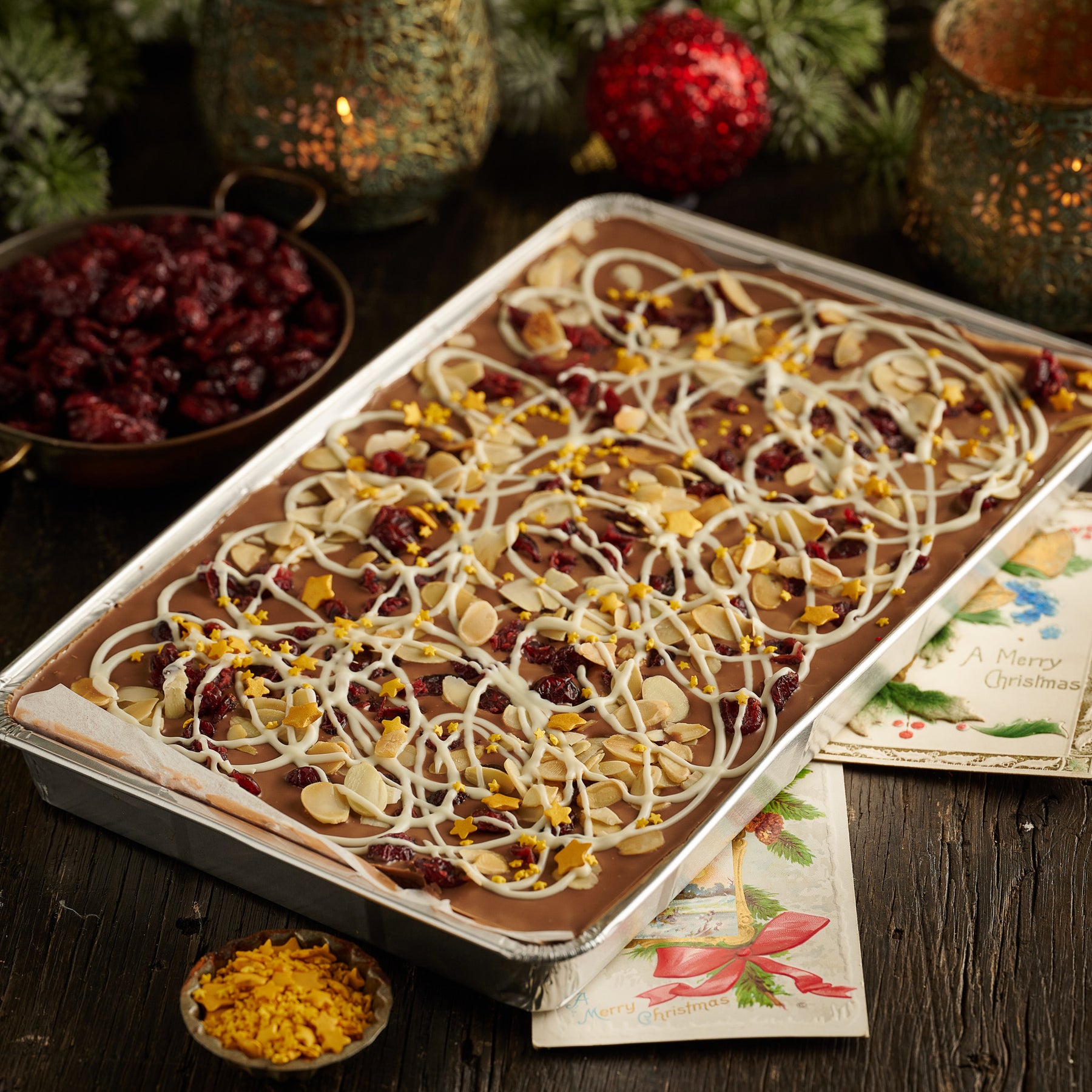All-butter flapjack baked with juicy cherries, topped with a layer of milk chocolate, scattered cranberries, toasted flaked almonds, a drizzle of white chocolate, and finished with shimmering gold stars.