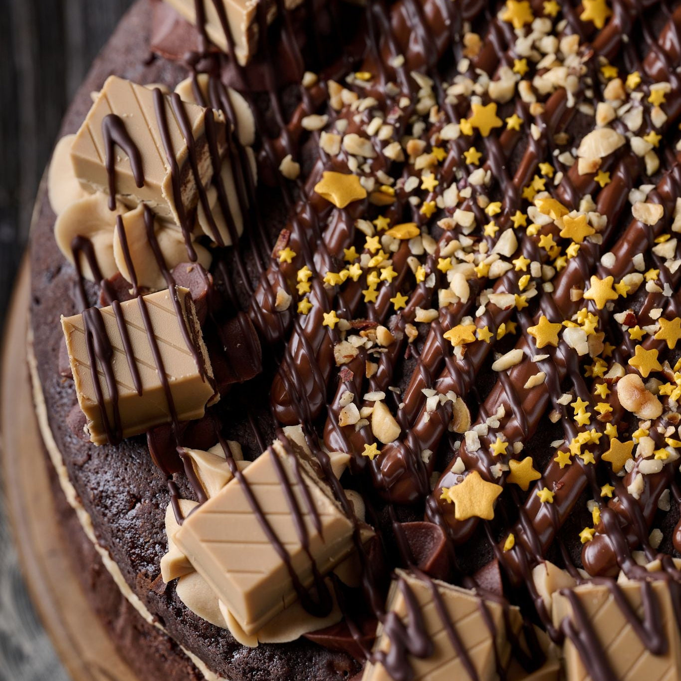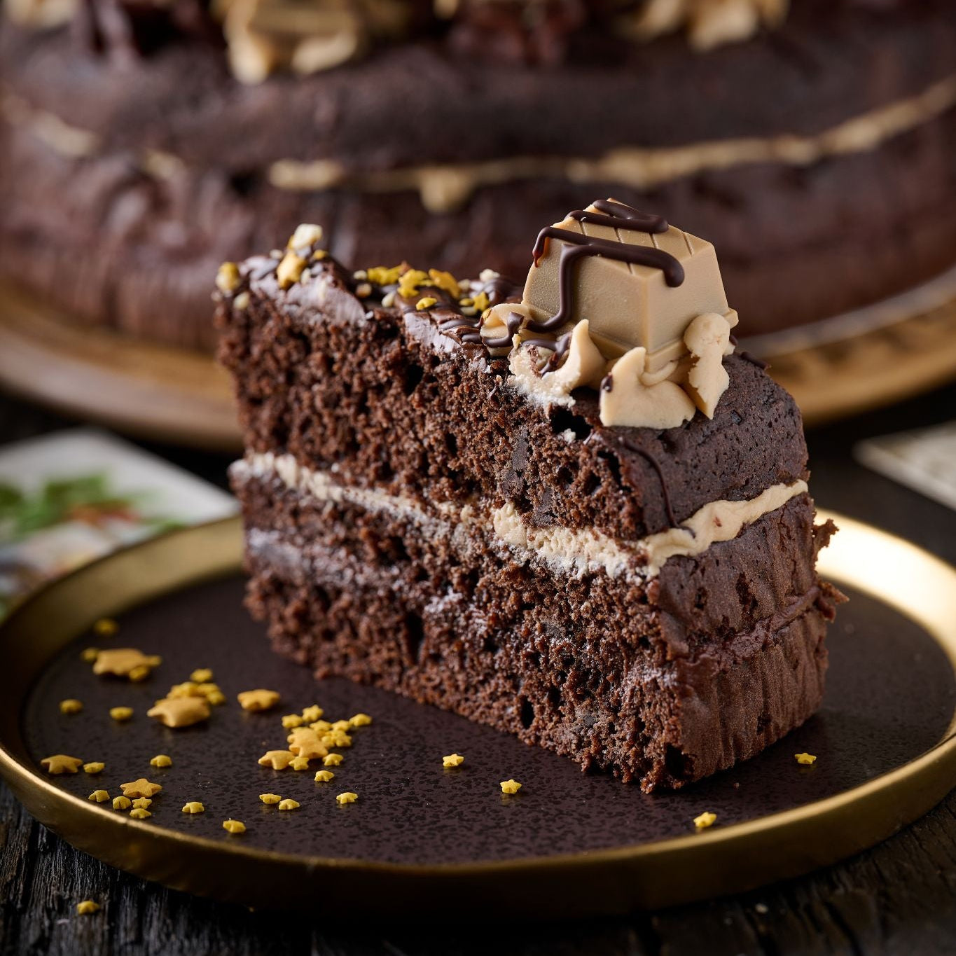 A rich chocolate sponge baked with milk chocolate chunks, split twice and filled with a layer of hazelnut frosting and a layer of chocolate hazelnut frosting. Finished with piped hazelnut frosting, a drizzle of hazelnut spread, dark chocolate drizzle, finished with Hazelnut Gold bar chunks, and gold star sprinkles.